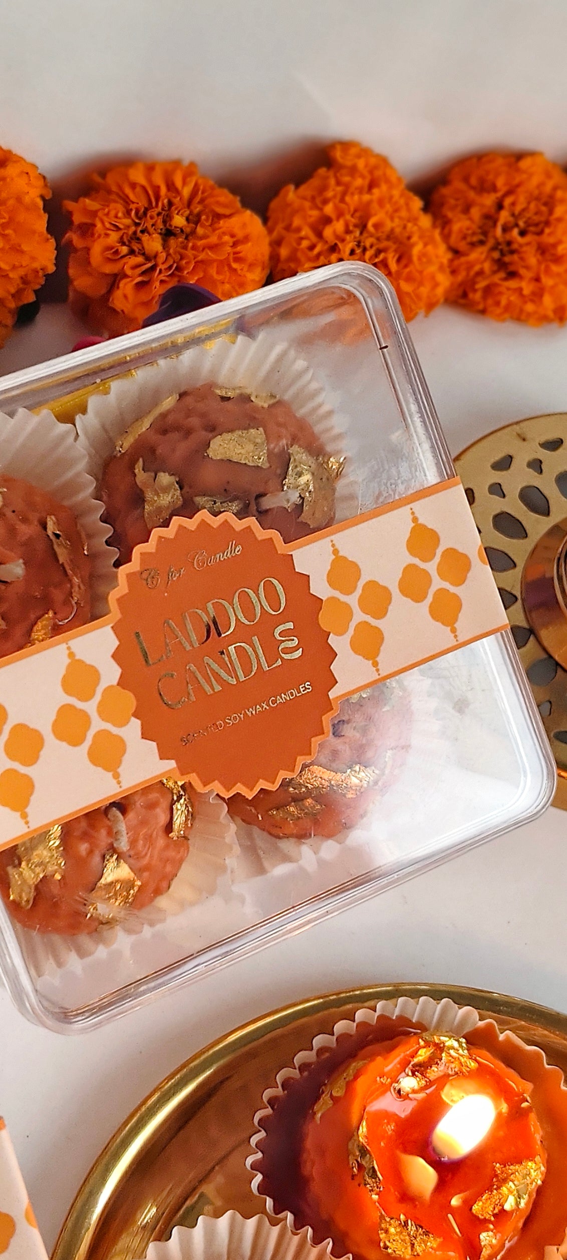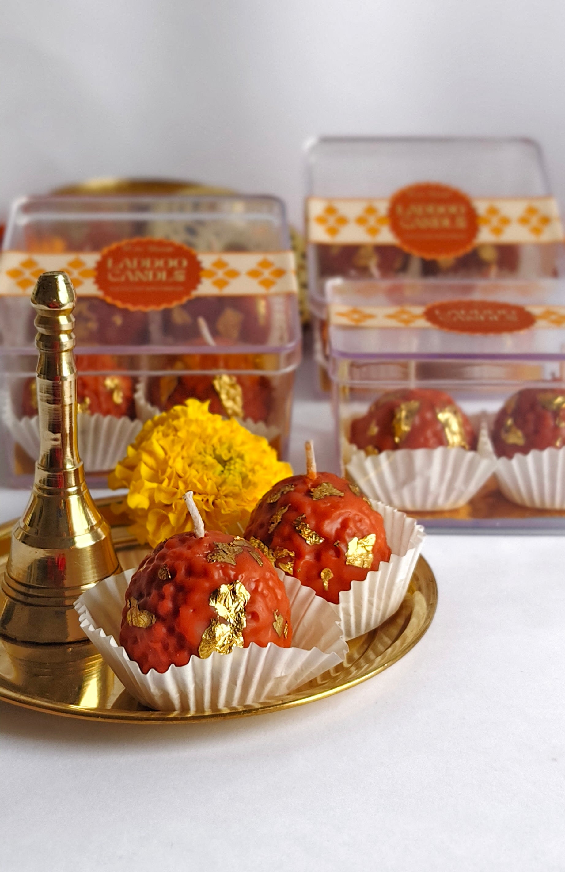 Laddoo Candles in Premium Acrylic Box Packaging. They look like Laddoo but is a Scented Candle. The Gold Foil work adds a touch of festive glamour and makes it a perfect Gift for the Festive Season
